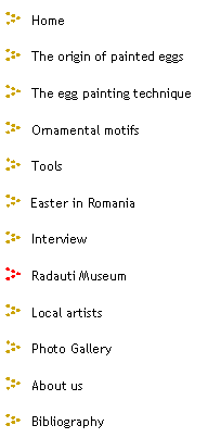 Generally speaking, when we talk about a collection, we can say that it certainly carries the imprint of the collector’s personality. It could be said that a museum which can be considered a mega-collection, a rich and complex collection is the container of the specificity of the place where it came into being. But there are, of course, some exceptions, like those unwonted museums which keep bazarre or at least strange collections. The Rădăuţi Museum carries the imprint of the old cultural traditions of the town, tipicall for a small land domestic one, having connection especially with close circles and literary clubs concerned with artistic matters. But we have, also to mention here Samuil Ionet, the real founder of the museum, and a passionate collectioner. His own beautiful collection, donated as a gesture of grate generosity to the museum represented a nucleus than in any time gathered around it more and more values for the museum. That’s why we have a privilege of watching his imposing image meeting us at the entrance of the museum. We talk about an oil painted portrait, placed between documentary maps that recommended the areas of ethnographic and museal interest in Bukovina. |
